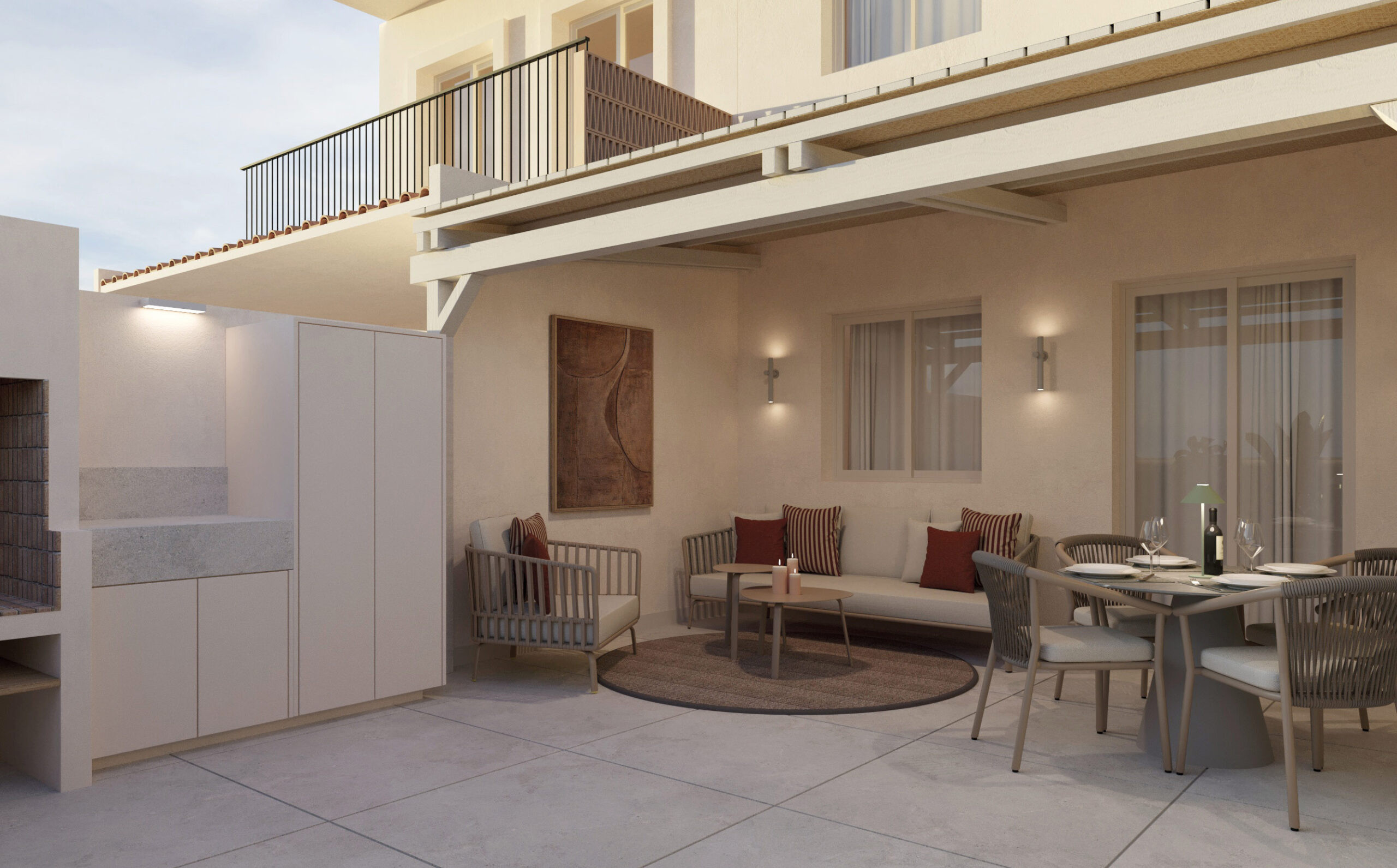 La zona de barbacoa se ha diseñado con un enfoque funcional: encimera de porcelánico igual que el pavimento, módulos de almacenaje integrados y armarios de gran capacidad, todo en acabados claros que armonizan con la arquitectura de la vivienda. Este rincón se convierte en el eje perfecto para encuentros sociales y momentos de disfrute gastronómico al aire libre.